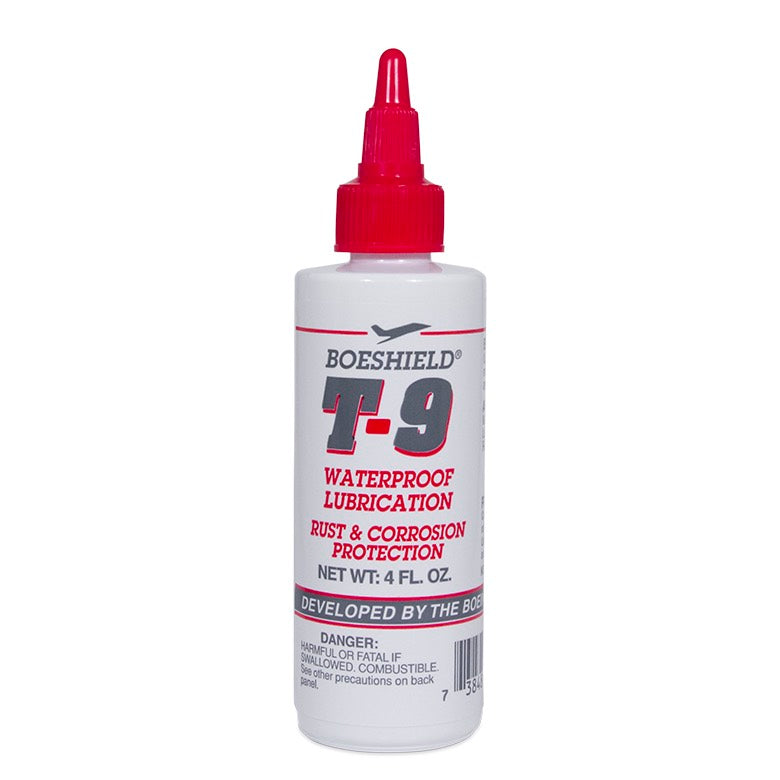 Boeshield T-9 was developed and licensed by global aerospace leader, The Boeing Company, to fill a need for high-performance, long-term metal protection and lubrication. T-9's rust preventative spray uses a unique formulation of solvent carrier and paraffin wax coating engineered to penetrate crevices deeply, displace moisture, dissolve minor corrosion, and leave a clean, waxy coating with lasting durability-without using Teflon, silicone, fluorocarbons, MEK, or acetone. Whether it be automotive, bicycle, industrial, lawn and garden, marine, RV or tools, T-9 continues to be the best option for rust prevention and waterproof lubrication. Boeshield is great for use in marine, bicycles, automotive, tools, RV's, and aviation Loosens rusty and corroded parts and is safe on paints, any metal surfaces, plastics, and vinyl Flushes out dirt and old lubricants, displaces moisture, and penetrates moving parts Dries to a thin, waxy film that clings to metal for months Developed by the Boeing company for lubrication and protection of aircraft components Call or email us with any questions or concerns