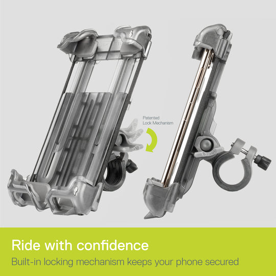 Hefty+ Phone Holder Built-in locking mechanism ensures your mobile phone is securely held Suitable for every bike, handlebar diameters up to 1 3/8"/35 mm Includes additional ElastoMount to connect to any bar and for quick on/off Integrated silicon bumpers protect your mobile device from scratches and reduce vibration