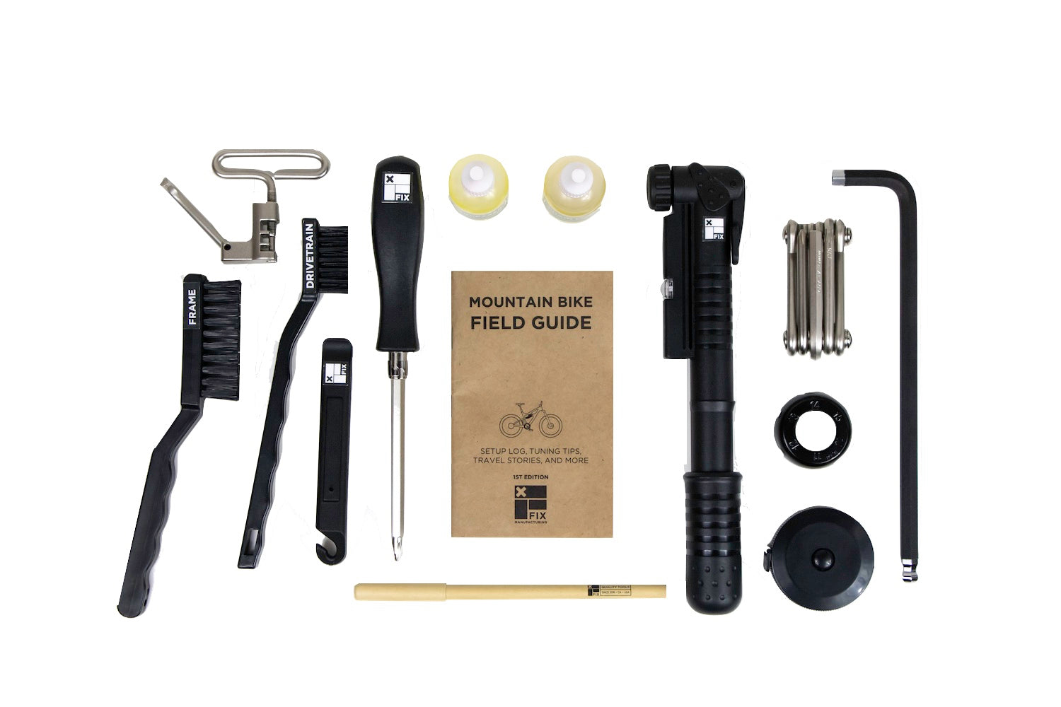 The MTB Field Kit is everything you need to prep your bike for today’s ride. Lube your chain, top off air pressure, and make trail specific adjustments to your setup. 16 tools and accessories included.Be at the trailhead and ride ready with the MTB Field Kit. Top off your tires with air, lube your chain, or dial in your suspension. A multi-tool is great for those trailside emergencies but often times your bike needs attention before the ride has even started. Use the included MTB Field Guide to keep track of your suspension setup and rider ergonomics. Includes 16 basic tools and accessories for ride readiness. Suggested storage for recommended key items as well. Also great for destination riding if you need to assemble a bike after flight.Features: Durable carry pouch MTB Field Guide 8 in 1 multi-tool Mini pump with pressure gauge Full size 8mm pedal wrench Chain breaker Tire levers (pair) Tape measurer for seat height / suspension sag Chain lube (refillable) Degreaser (refillable) 6 in 1 spoke wrench 2 in 1 screwdriver Frame detail brush Chain brush for cogs and pulleys Shop rag Pen for MTB Field Guide Additional Storage:Room for – Shock pump Spare tube Chain quick links Spare brake pads Replacement cleats / hardware Derailleur hanger Tire sealant Tire plugs