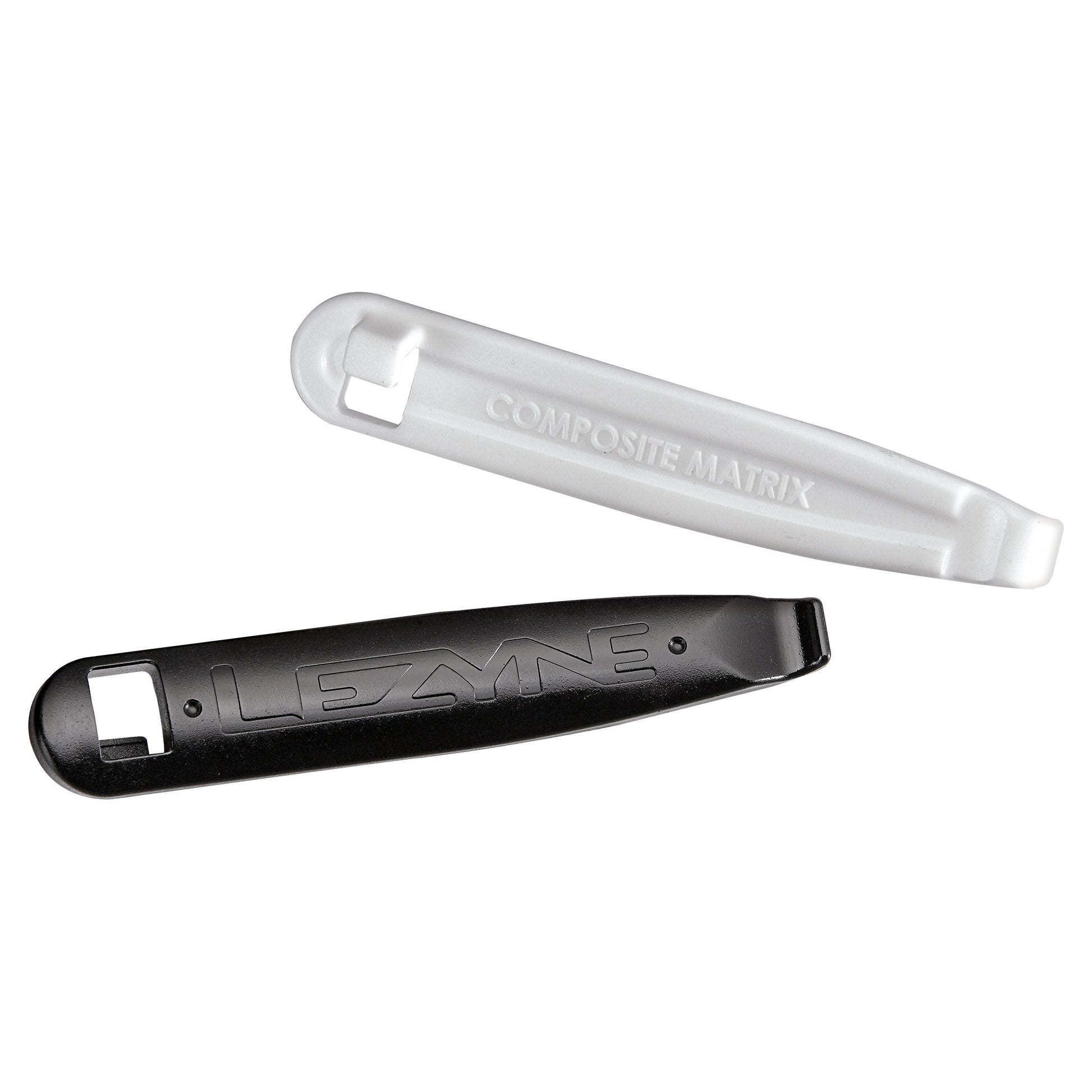 Tire levers built from strong, fiber-reinforced Composite Matrix material. Aggressive hook geometry makes tire removal easy. Comfortable, wide handle design with integrated spoke hook.