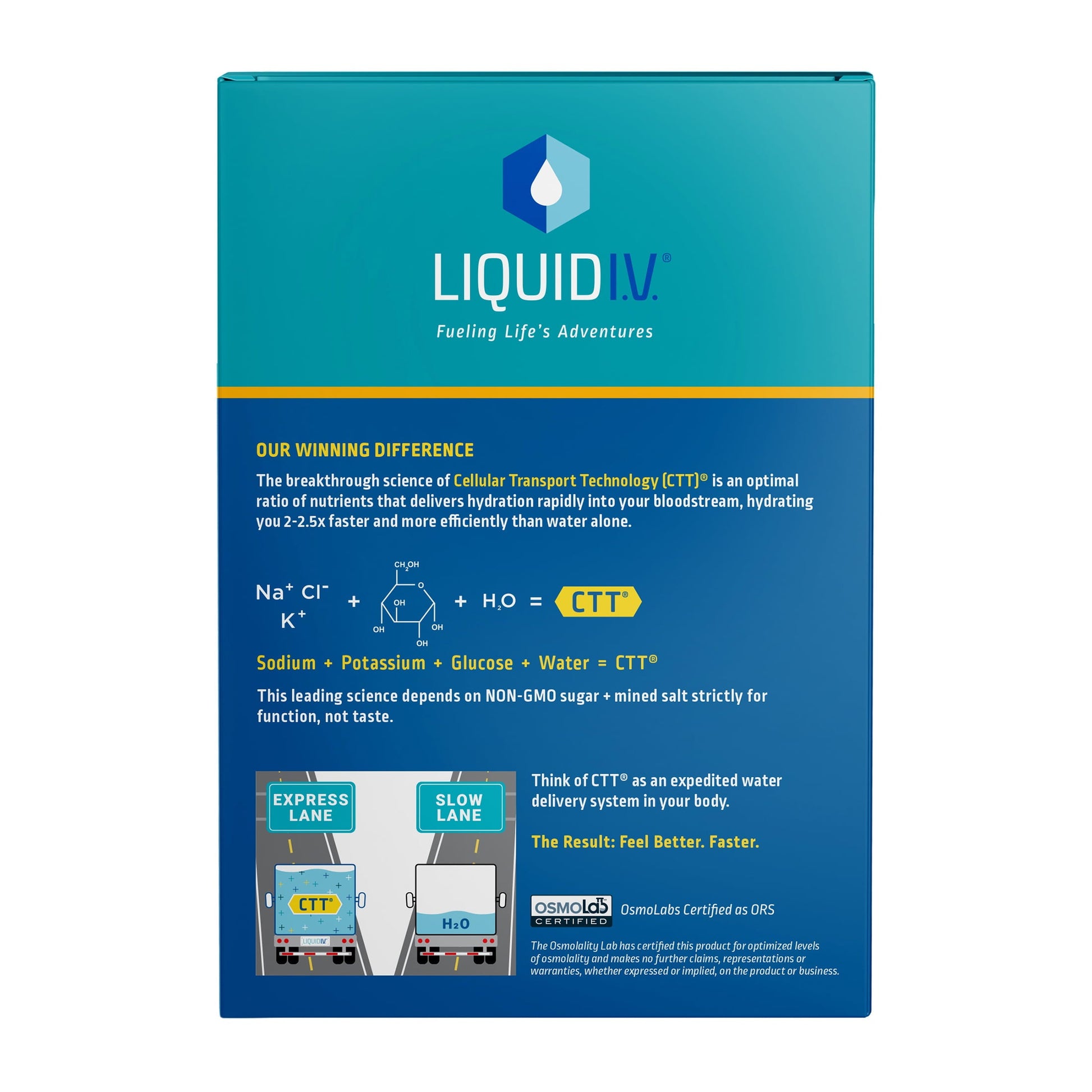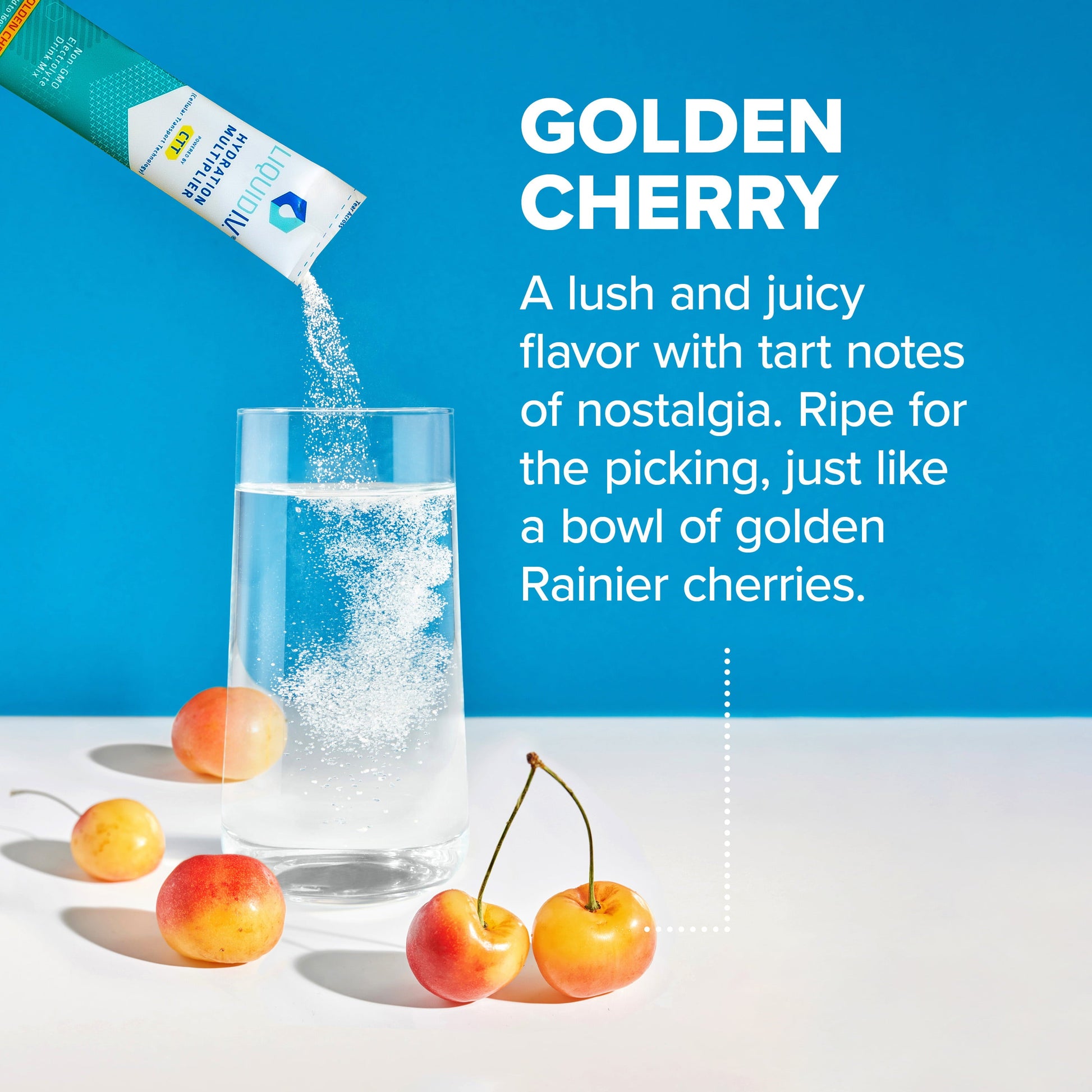 Product detailsLiquid I.V.'s Hydration Multiplier is a great-tasting, non-GMO electrolyte powder drink mix powered by Cellular Transport Technology (CTT)® designed to enhance rapid absorption of water and other key ingredients into the bloodstream. Typically, when you drink fluids, they pass through the entire digestive system, losing water before your body can absorb it. CTT® uses a precise ratio of sodium, glucose, and potassium to create an osmotic force that allows water to be delivered to the bloodstream earlier on in the digestive system. Liquid I.V. Hydration Multiplier can hydrate faster and more efficiently than water alone. 1 serving contains 3x the electrolytes of traditional sports drinks and 5 essential vitamins.Translation? More fuel for life's adventures.WE ARE ON A MISSION TO CHANGE THE WORLD. For every purchase of Liquid I.V., we donate a serving to someone in need. Since 2015, we have donated over 19 million servings globally.Liquid I.V. Hydration Multiplier Electrolyte Powder Packet Drink Mix, Golden Cherry, 15 Ct Hydration Multiplier, our great tasting, non-GMO electrolyte drink mix, is powered by CTT® to deliver hydration to the bloodstream faster and more efficiently than water alone. Experience a lush and juicy flavor with tart notes of nostalgia. Ripe for the picking, just like a bowl of golden Rainier cherries. Cellular Transport Technology, or CTT®, is the breakthrough delivery system, used in all of our products, designed to enhance rapid absorption of water and other key ingredients into the bloodstream. Made with premium ingredients, Hydration Multiplier Electrolyte Powder Drink Mix contains 5 essential vitamins including Vitamins B3, B5, B6, B12 and Vitamin C. These non-GMO drink mixes are also gluten-free, soy-free, and dairy-free. CONVENIENCE Single-serving, travel-friendly packets are easy to enjoy on the go. Pour one packet into 16 oz of water, mix or shake, and hydrate. Liquid I.V. provides much-needed hydration in disaster zones, hospitals, impoverished communities, and emergency living quarters across the globe. Since 2015, we have donated over 19 million servings. InstructionsSuggested Use: Add 1 stick to 16 oz of water and mix thoroughly before drinking. Take as needed to support hydration. Recommended by doctors and safe for kids. Store in a cool, dry place.IngredientsPure Cane Sugar, Dextrose, Citric Acid, Salt, Potassium Citrate, Sodium Citrate, Dipotassium Phosphate, Silicon Dioxide, Rebaudioside-A (Stevia Leaf Extract), Vitamin C (Ascorbic Acid), Vitamin B3 (Niacinamide), Vitamin B5 (D-Calcium Pantothenate), Natural Flavor, Vitamin B6 (Pyroxine Hydrochloride), Vitamin B12 (Cyanocobalamin)