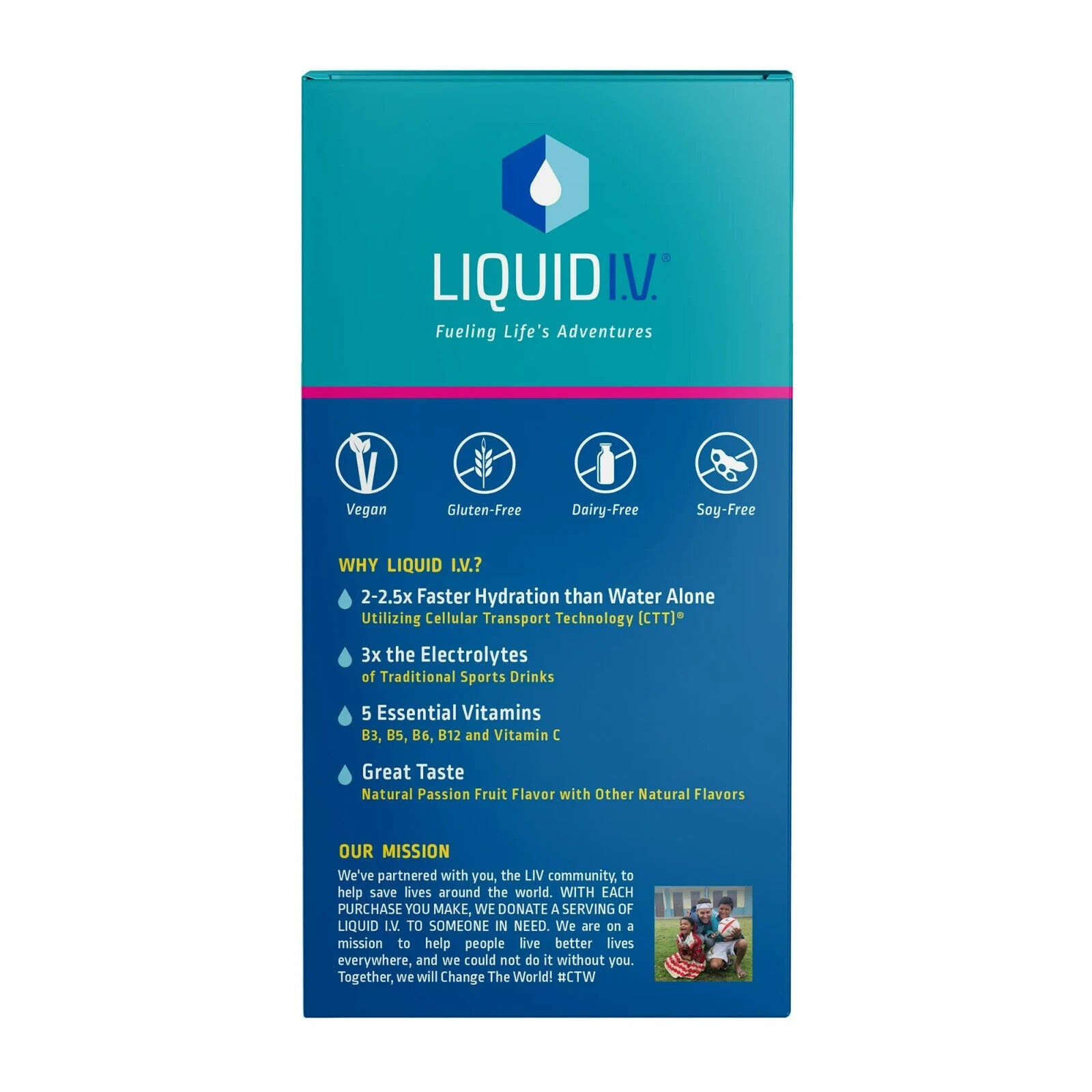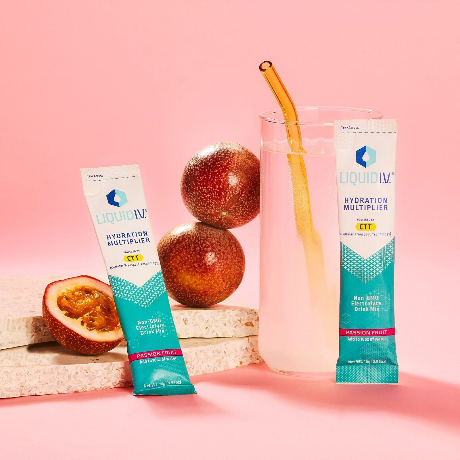Product detailsLiquid I.V.'s Hydration Multiplier is a great-tasting, non-GMO electrolyte powder drink mix powered by Cellular Transport Technology (CTT)® designed to enhance rapid absorption of water and other key ingredients into the bloodstream. Typically, when you drink fluids, they pass through the entire digestive system, losing water before your body can absorb it. CTT® uses a precise ratio of sodium, glucose, and potassium to create an osmotic force that allows water to be delivered to the bloodstream earlier on in the digestive system. Liquid I.V. Hydration Multiplier can hydrate faster and more efficiently than water alone. 1 serving contains 3x the electrolytes of traditional sports drinks and 5 essential vitamins.Translation? More fuel for life's adventures.WE ARE ON A MISSION TO CHANGE THE WORLD. For every purchase of Liquid I.V., we donate a serving to someone in need. Since 2015, we have donated over 19 million servings globally.Liquid I.V. Hydration Multiplier Electrolyte Powder Packet Drink Mix, Passion Fruit, 15 Ct Hydration Multiplier, our great tasting, non-GMO electrolyte drink mix, is powered by CTT® to deliver hydration to the bloodstream faster and more efficiently than water alone. This invigorating flavor, inspired by the Hawaiian lilikoi, has hints of honey and berry, and brings to mind white sand beaches and clear blue water. Cellular Transport Technology, or CTT®, is the breakthrough delivery system, used in all of our products, designed to enhance rapid absorption of water and other key ingredients into the bloodstream. Made with premium ingredients, Hydration Multiplier Electrolyte Powder Drink Mix contains 5 essential vitamins including Vitamins B3, B5, B6, B12 and Vitamin C. These non-GMO drink mixes are also gluten-free, soy-free, and dairy-free. CONVENIENCE Single-serving, travel-friendly packets are easy to enjoy on the go. Pour one packet into 16 oz of water, mix or shake, and hydrate. Liquid I.V. provides much-needed hydration in disaster zones, hospitals, impoverished communities, and emergency living quarters across the globe. Since 2015, we have donated over 19 million servings. InstructionsSuggested Use: Add 1 stick to 16 oz of water and mix thoroughly before drinking. Take as needed to support hydration. Recommended by doctors and safe for kids. Store in a cool, dry place.IngredientsPure Cane Sugar, Dextrose, Citric Acid, Salt, Potassium Citrate, Sodium Citrate, Dipotassium Phosphate, Silicon Dioxide, Rebaudioside A (Stevia Leaf Extract), Vitamin C (Ascorbic Acid), Vitamin B3 (Niacinamide), Vitamin B5 (D-Calcium Pantothenate), Vitamin B6 (Pyridoxine Hydrochloride), Natural Flavor, Vitamin B12 (Cyanocobalamin)