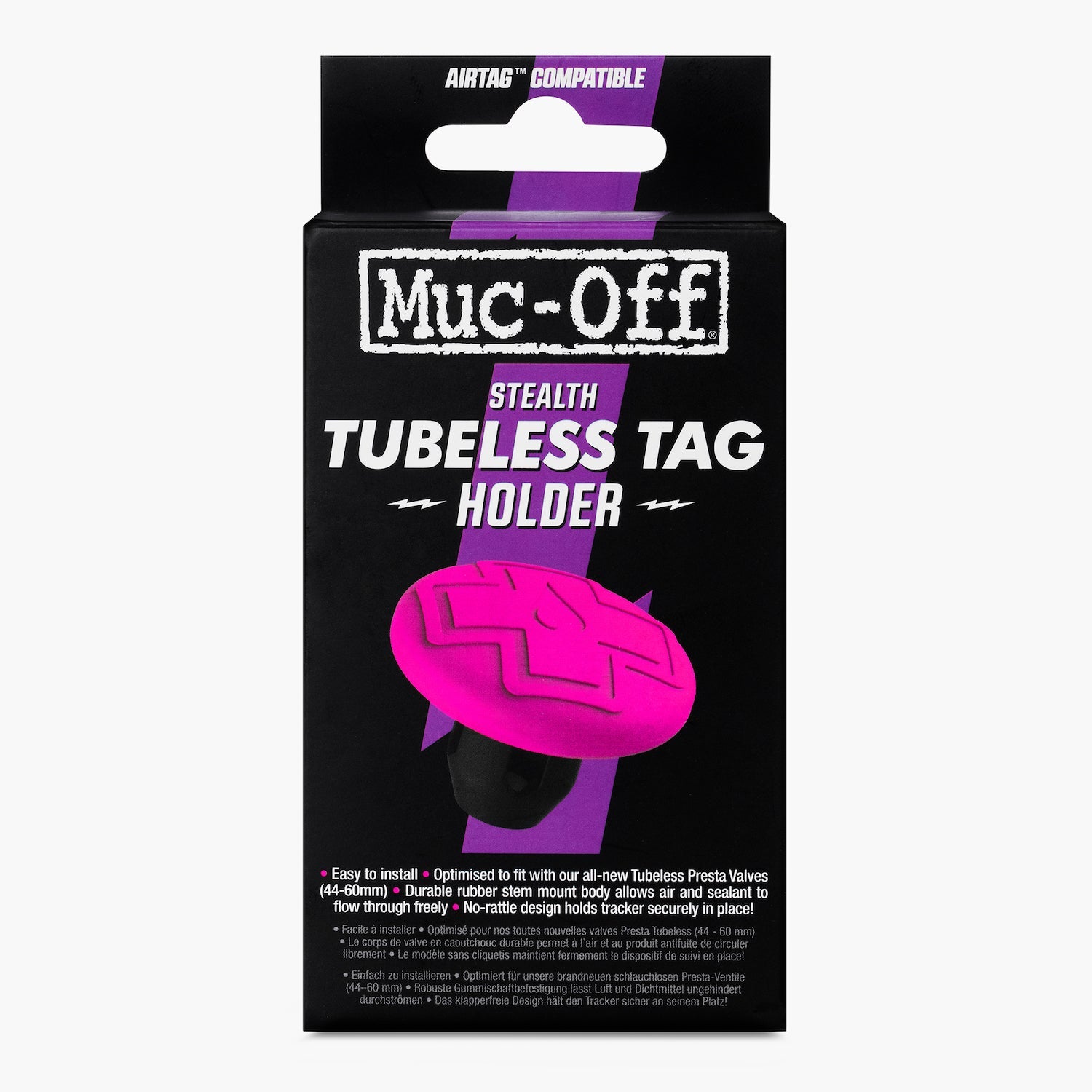 The Muc-Off Tubeless Tag Holder offers a discreet way to install a tracker inside your rear tubeless bicycle tyre in conjunction with our All-New Tubeless Valves (will also work with our V1 presta valves), meaning you can track down your bike in the event of theft and can locate it using the Find My iPhone App. Your tracker will be housed in a protective, 3-part silicone and rubber tubeless valve mount and supplied with our range of tubeless valve bases, so you can ensure an airtight seal is achieved against your rim when installing inside your tubeless tyre. Optimised to fit with our All-New Tubeless Presta Valves (44-60mm). Will also work with our V1 presta valves Sacrificial stem, ensures tracker and rim protection even after a big hit to the wheel Durable rubber stem mount body allows air and sealant to flow through freely Supplied with 3 pairs of our rubber valve bases Weighs 7.5g without AirTag - 18.7g with AirTag Please note: AirTag Tracker & All-New Tubeless Valves are not included with the mount, sold separately. Only compatible with our All-New Tubeless Valves.