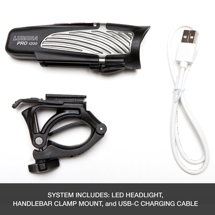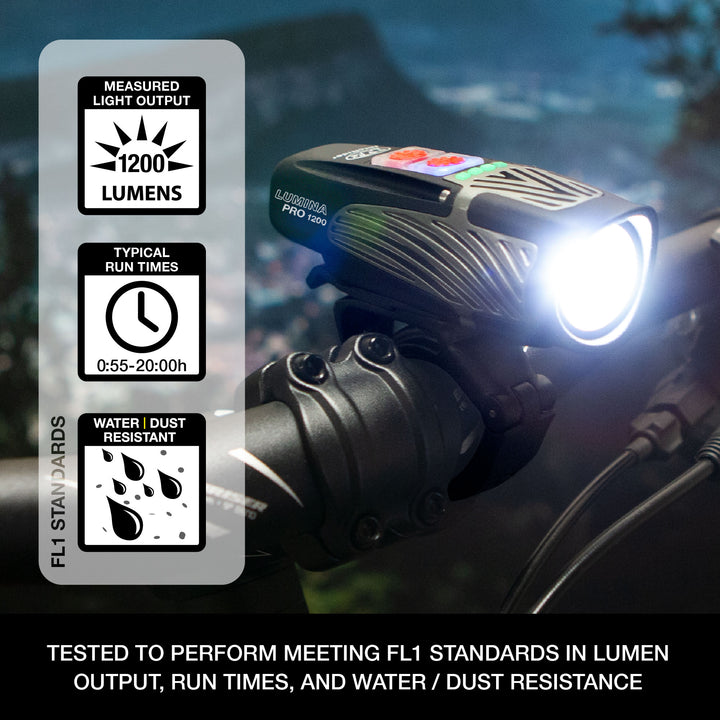 Boasting 1200 lumens with a sleek form factor and a collimator lense that lends to a brilliant even light beam pattern. NiteRider makes this newcomer USB-C rechargeable for convenient on-the-go charging. A feature of note on the 1200 are color-coded light modes shown through the dual button power switch. Its light weight at 193 grams makes it quite suitable as a helmet mountable option as well as bar compatible—standard and oversized diameters. The Lumina Pro 1200 features a highly durable light housing with Fiberglass reinforced nylon meeting all required FL1 Standards for run times, impact testing and dust/water resistance.Features: Lumen Output: 1200 VerifiR NFC Technology 8 Modes with Run Times: 0:55-20:00h Charge Time: 4:00h Weight: 193 grams Water / Dust Resistant IP64 Rated Dual Button Power Switch, Brighter (+)/ Dimmer (-) USB-C Rechargeable Includes: Lumina Pro 1200 front light, handlebar clamp mount and USB-C charging cable