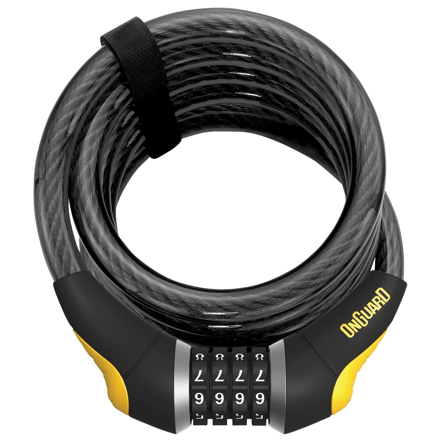Doberman series coil cable locks are lightweight, easy to carry, available with either keyed or combination lock mechanisms and offer fast, convenient security for medium to low-risk situations. Heavy-duty braided steel cables are self-coiling for convenience The vinyl coating protects paint and finishes Lock heads are permanently forged to cable ends Double rubber-coated lock head covers protect paint and finishes Key locks feature X2P Double Bolt lock heads for ultimate pull resistance and Z-cylinder which protects against picking and bump attacks. Combo locks feature a Steel Ball Combo gear system with a 4-digit user-settable combination The attached velcro straps contain unruly coils during transport Most models include All-Tube Twist Lock mounting bracket Key locks include 5 laser-cut keys, 1 with micro-LED 8031GLO combo lock features internal LED backlights to make it easier to see tumblers in the dark Padlock models (8033 and 8034) do not include a bracket or LED key Size: Length: 6’, Thickness: 12mm, Weight: 7.4 Key/Combo: Combo Security Rating: 40
