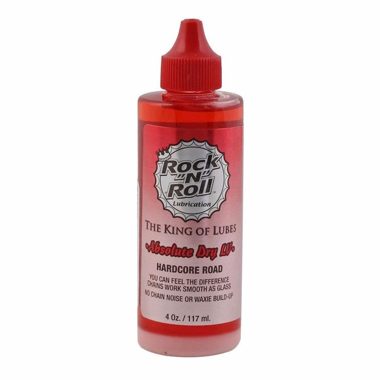 Rock "N" Roll is the self proclaimed "King of Lubes", offering 3 different types of chain lubricants: Extreme, Absolute, and Gold. All three lines are formulated to simultaneously clean and lube your chain. The lubricant penetrates the deep dark crevices of your chain to trap any dirt and, with the energy of the chain freewheeling backwards, forces the dirt to the surface to be easily wiped off. The remaining lubricant left on the chain creates a protective membrane that keeps out dirt and moisture while also providing longer chain life, smoother shifting, and better pedaling efficiency. Rock "N" Roll Absolute Dry Lube is designed specifically for road bikes, using a thicker and dryer membrane to prevent dirt and moisture from getting into the chain. This means no waxy buildup and a very, very quiet drivetrain! APPLICATION PROCESS Shake well and apply a stream of lube to the chain at the cassette. Do not drip the lube on like you would oil. This is not oil! Get the chain really wet, this stuff cleans and lubes all in one. Freewheel the chain backwards for about 5 seconds...no less. Wipe off all the excess lube... all of it, wipe the chain as clean as it will get. That's it go ride...
