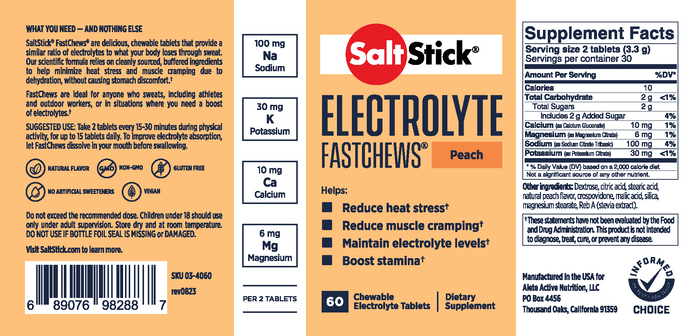 SaltStick FastChews revolutionize hydration with a faster, more convenient way to replenish electrolytes. The innovative, chewable tablets are clinically proven to start working in 45 seconds – no mixing and no waiting. Just chew.SUGGESTED USE: Chew 2 tablets for every 30 minutes of exercise. For maximum effect, chew completely before swallowing. Drink water as needed.Ingredients: Dextrose, citric acid, stearic acid, natural peach flavor, natural vegetable color (annatto seed extract, turmeric root extract, red radish extract), malic acid, magnesium stearate, Reb A (stevia leaf extract)