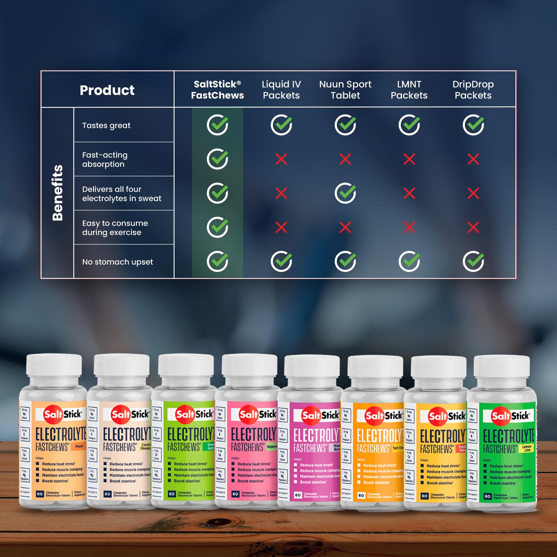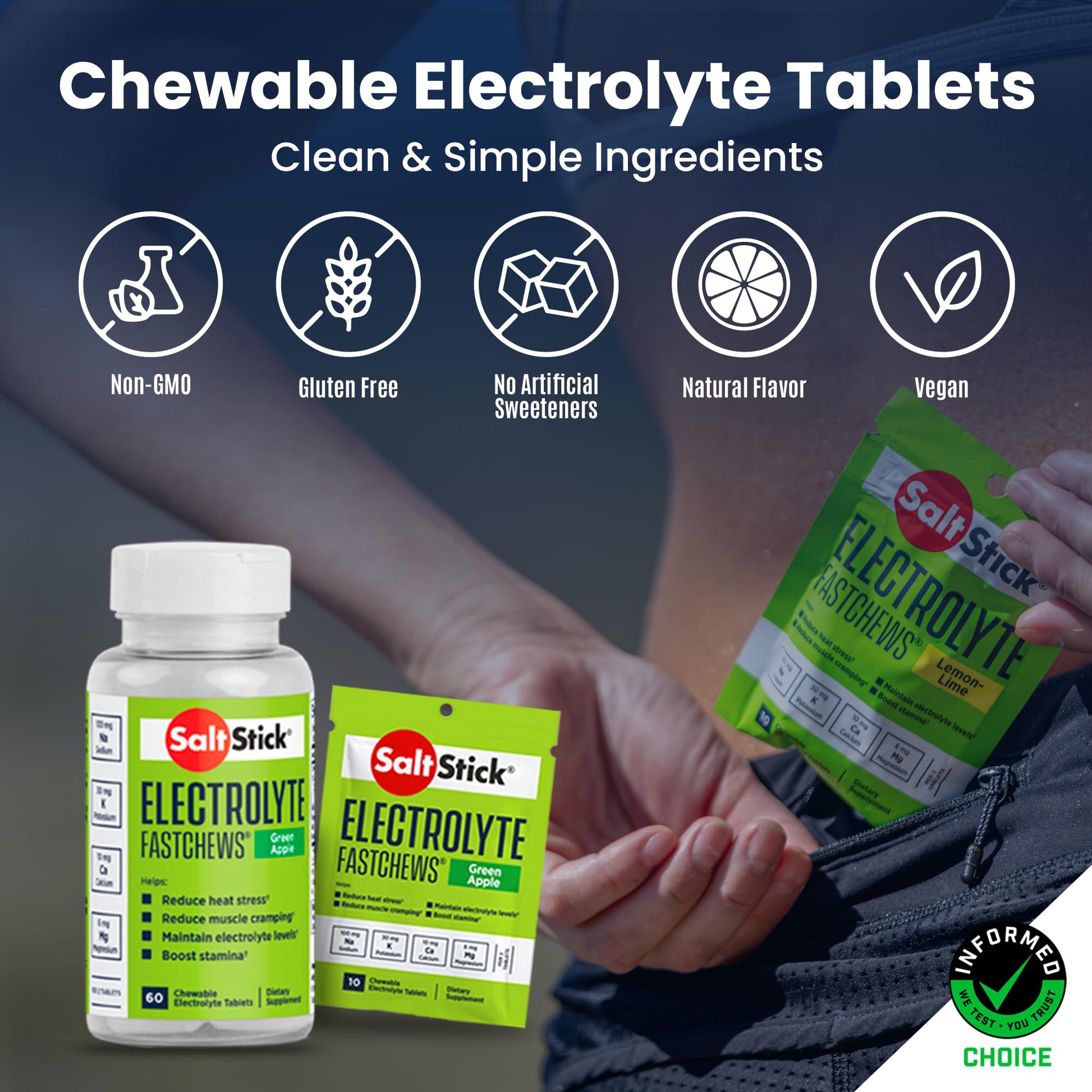 SaltStick FastChews revolutionize hydration with a faster, more convenient way to replenish electrolytes. The innovative, chewable tablets start working within minutes – no mixing and no waiting. Just chew.SUGGESTED USE: Chew 2 tablets for every 30 minutes of exercise. For maximum effect, chew completely before swallowing. Drink water as needed.Ingredients: Dextrose, citric acid, stearic acid, natural green apple flavor, magnesium stearate, natural vegetable color (spirulina extract, turmeric root extract), Reb A (stevia leaf extract)