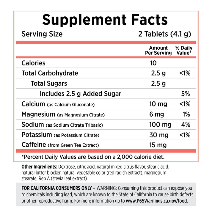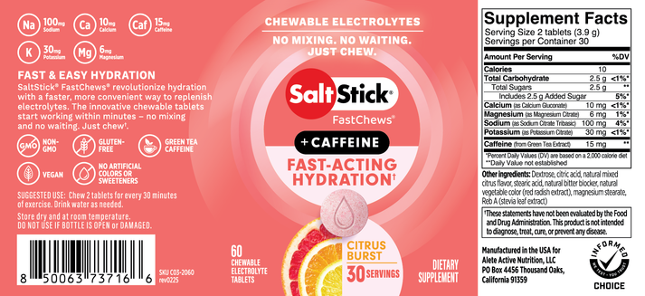 SaltStick FastChews revolutionize hydration with a faster, more convenient way to replenish electrolytes. The innovative, chewable tablets are clinically proven to start working within minutes – no mixing and no waiting. Just chew. Enjoy 15 mg of caffeine for an added boost! SUGGESTED USE: Chew 2 tablets for every 30 minutes of exercise. For maximum effect, chew completely before swallowing. Drink water as needed.Ingredients: Dextrose, citric acid, natural mixed citrus flavor, stearic acid, natural bitter blocker, natural vegetable color (red radish extract), magnesium stearate, Reb A (stevia leaf extract)