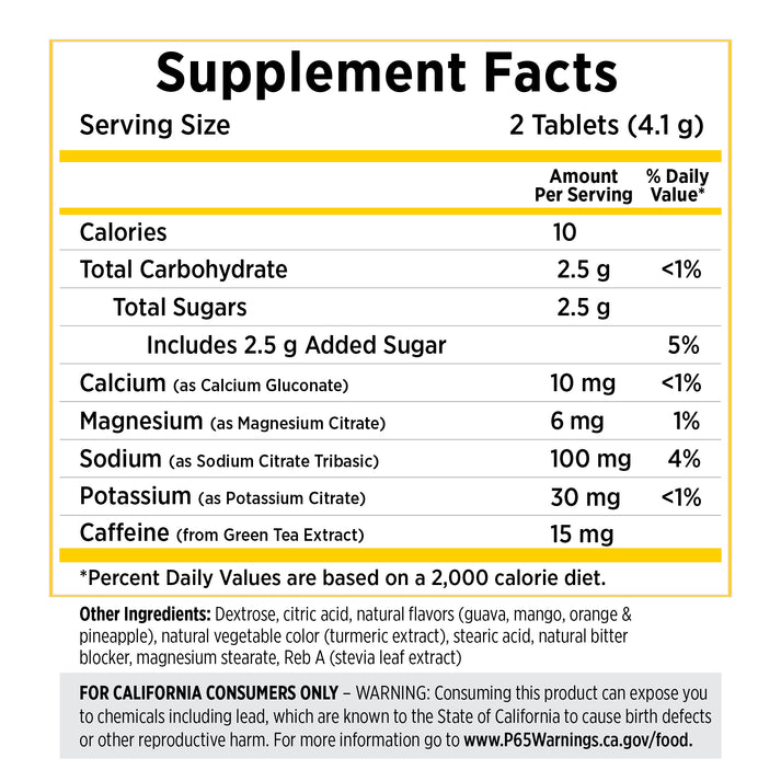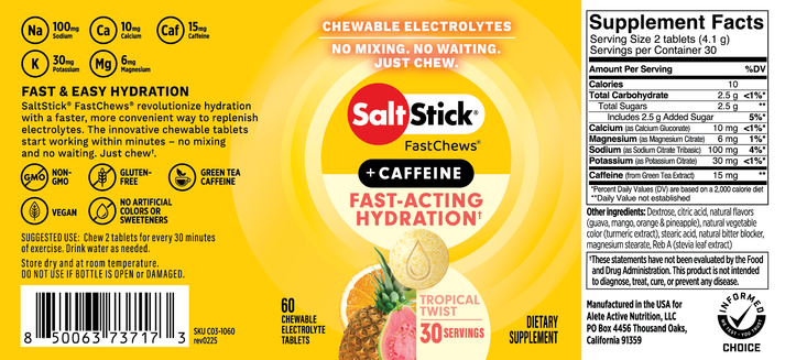 SaltStick FastChews revolutionize hydration with a faster, more convenient way to replenish electrolytes. The innovative, chewable tablets are clinically proven to start working within minutes – no mixing and no waiting. Just chew. Enjoy 15 mg of caffeine for an added boost! SUGGESTED USE: Chew 2 tablets for every 30 minutes of exercise. For maximum effect, chew completely before swallowing. Drink water as needed.Ingredients: Dextrose, citric acid, natural flavors (guava, mango, orange & pineapple), natural vegetable color (turmeric extract), stearic acid, natural bitter blocker, magnesium stearate, Reb A (stevia leaf extract)