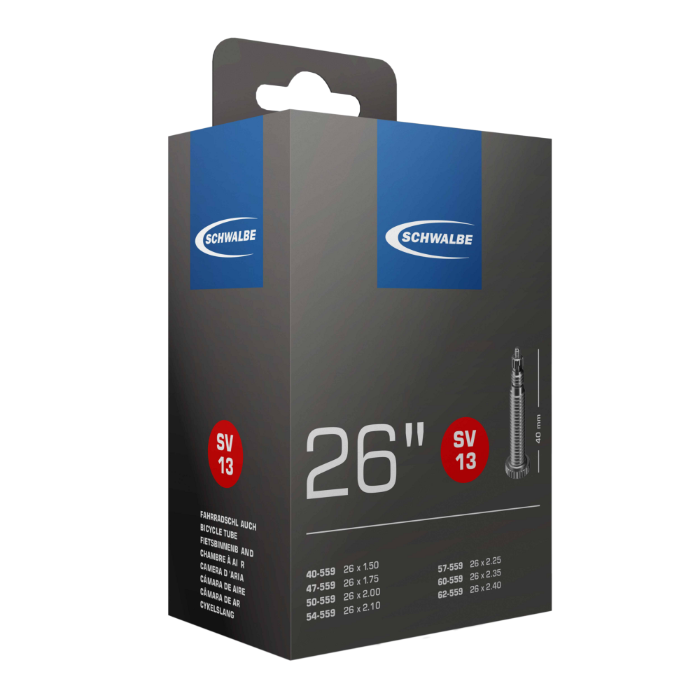 Schwalbe Standard tube Item 13. For bicylce tires in 26" inch (ETRTO 40/62-559). Especially recommended for MTB. Retains air pressure considerably long. Due to the best material quality and constant wall thickness. Highest reliability. Proven millions of times.