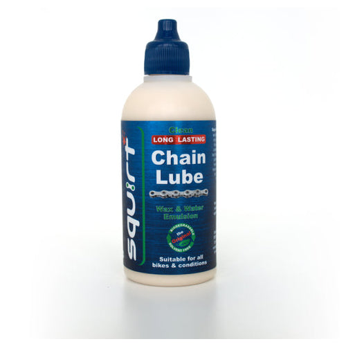 Squirt is what every cyclist wants: A long-lasting dry chain lube that does not gather dirt. The first successful biodegradable wax/water emulsion containing as much wax as needed to last for the duration of a marathon ride. It prolongs the life of your drivetrain by reducing friction while improving shifting and reducing irritating dry chain noise. No degreasing is required for repeat use. If needed, your chain can be cleaned with a clean, dry brush. Excellent for wet & dry conditions Stays clean Reduces chain noise & chainsuck For use on all bicycle chain types Biodegradable, PFAS-free formula, Solvent-free