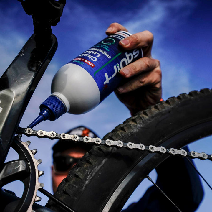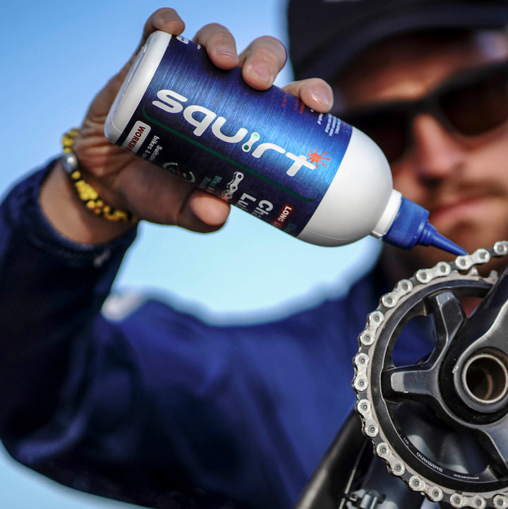 Squirt is what every cyclist wants: A long-lasting dry chain lube that does not gather dirt. The first successful biodegradable wax/water emulsion containing as much wax as needed to last for the duration of a marathon ride. It prolongs the life of your drivetrain by reducing friction while improving shifting and reducing irritating dry chain noise. No degreasing is required for repeat use. If needed, your chain can be cleaned with a clean, dry brush. Excellent for wet & dry conditions Stays clean Reduces chain noise & chainsuck For use on all bicycle chain types Biodegradable, PFAS-free formula, Solvent-free