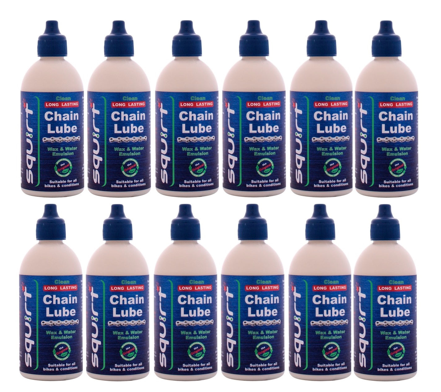 Squirt is what every cyclist wants: A long-lasting dry chain lube that does not gather dirt. The first successful biodegradable wax/water emulsion containing as much wax as needed to last for the duration of a marathon ride. It prolongs the life of your drivetrain by reducing friction while improving shifting and reducing irritating dry chain noise. No degreasing is required for repeat use. If needed, your chain can be cleaned with a clean, dry brush. Excellent for wet & dry conditions Stays clean Reduces chain noise & chainsuck For use on all bicycle chain types Biodegradable, PFAS-free formula, Solvent-free