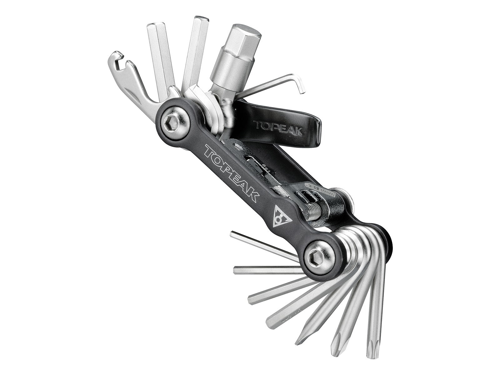 The lightest 20 function mini tool. It packs in a compact, durable package with its own neoprene case. Includes a mini 4 mm Allen key for self-maintenance. FUNCTIONS: 20, allen wrench, spoke wrench, tire levers, chain tool, screw drivers, bottle opener, ADDED FEATURES: Secondary chain link fence, Pad spreader Chain pin breaker, Self-tightening tool TOOL MATERIAL: Chrome vanadium steel BODY: Forged aluminum BAG MATERIAL: Neoprene SIZE: 3.2” x 1.7” x 0.8” WEIGHT: 6.51 oz