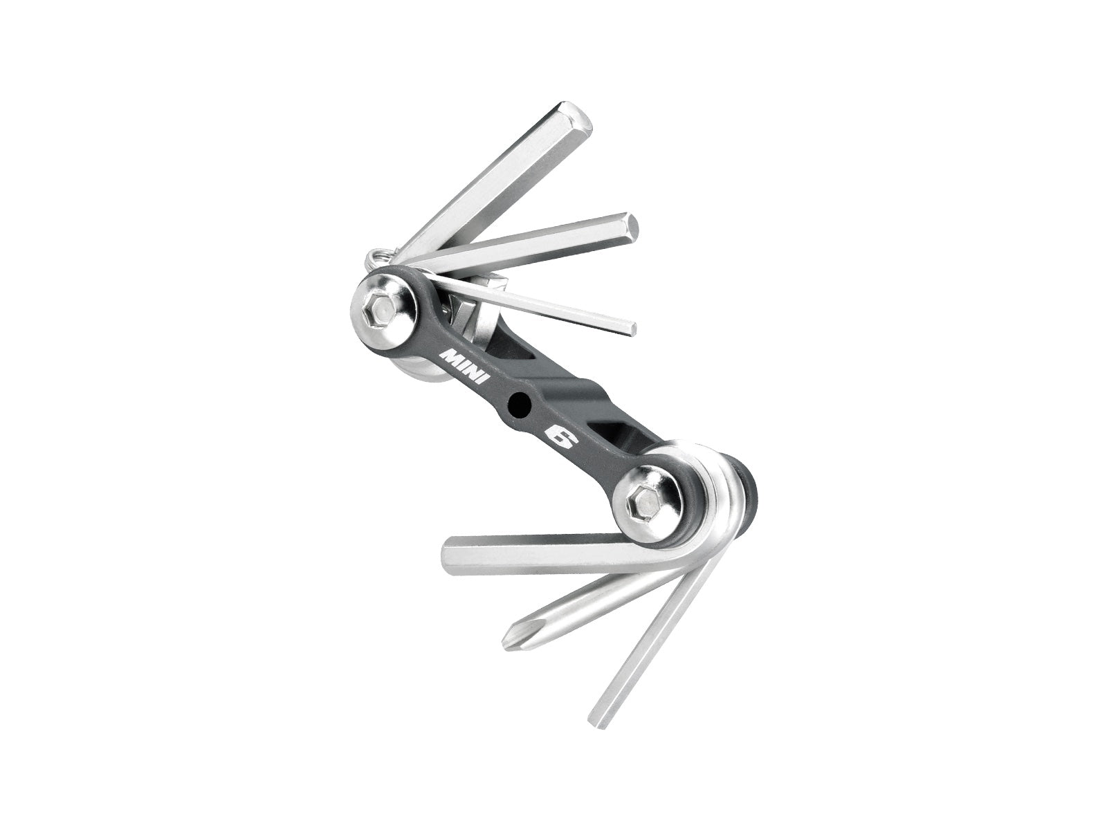 Ultra lightweight performer. The Mini 6 has the essential tools needed in a micro-sized package. Perfect for the roadie who like to travel light. ALLEN WRENCHES: 2 / 3 / 4 / 5 / 6 mm BODY: Extruded aluminum FUNCTIONS: 6 SCREW DRIVER: #2 Phillips SIZE: 2.6”x 1.1” x 0.7” TOOL MATERIAL: Chrome vanadium steel WEIGHT: 2.57 oz