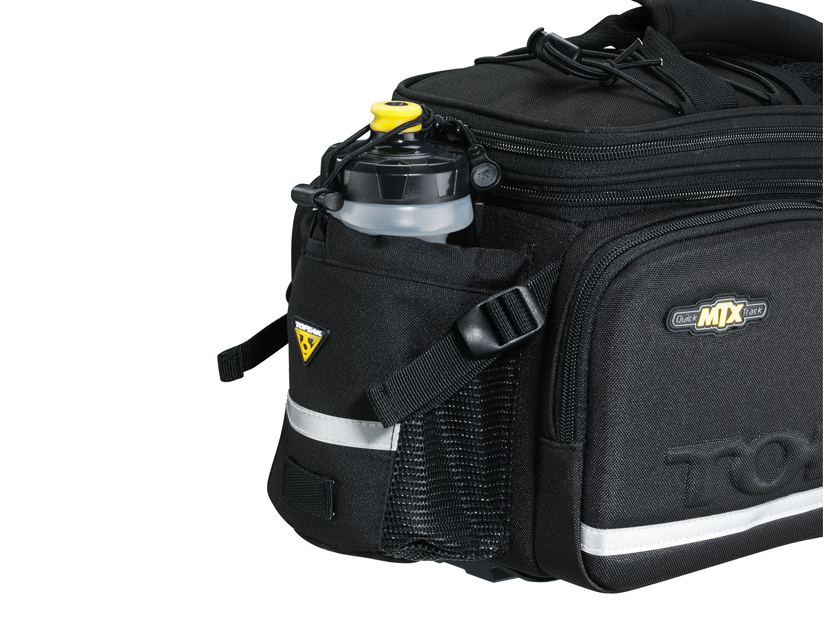 MTX TrunkBag DX featuring a divided main compartment, two zippered side pockets and rear water bottle holder. Our unique construction process combines molded panels and flexible fabric for rigidity and water repellency. Compatible with all MTX QuickTrack® racks. CAPACITY: 12.3 L COMPARTMENTS: 1 divided main, Two side zippered, Multi-expanding top MATERIAL: 600 denier polyester MAX LOAD: Limited to rack max load rating INSULATION: Rigid EVA foam BAG ATTACHMENT: MTX QuickTrack® system ADDED FEATURES: Water bottle holder, Shoulder strap, Carrying handle, Elastic top bungees, 3M™ reflective strip, Safety light clip Optional rain cover SIZE: 14.2” x 9.8” x 8.5”-11.4” WEIGHT: 2.17 lb