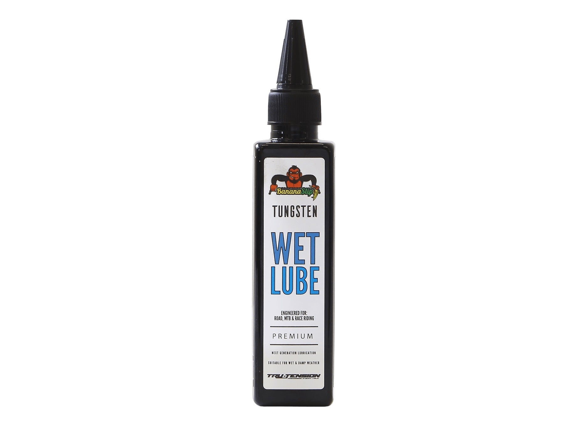 Our state-of-the-art, multi-layered Tungsten Wet Lube is a blend of biodegradable oils which penetrate all parts of the chain for a silky smooth ride. BananaSlip Wet Lube sticks to the surface of the chain for continued lubrication even in the harshest environments. Water and dirt quickly peel away from the surface of the chain as the lubricant strips back contaminants while you ride. After the first couple of applications, the Tungsten smooths out the small imperfections in the metal surfaces of the chain, creating a rock-hard protective and ultra-slippery layer. The perfect lubricant for riding in wet and muddy conditions, unlike standard lubricants which quickly run off. Ideal for road and off-road riding, as well as on shifters, pedals, and derailleurs.Features: Improve Performance Prolong Cassette Life Increase Chain Life Less Dirt Build Up Smoother Ride 50ml bottle content. Directions for use: Step 1: Degrease chain, chainring, and cassette thoroughly. Step 2: Shake the bottle well before application. Step 3: Apply lubricant evenly to all parts of the chain. Step 4: Allow drying for 5 minutes before riding. Step 5: Apply as needed for continuous lubrication. *Important: Avoid contact with braking components. Keep out of reach of children.*