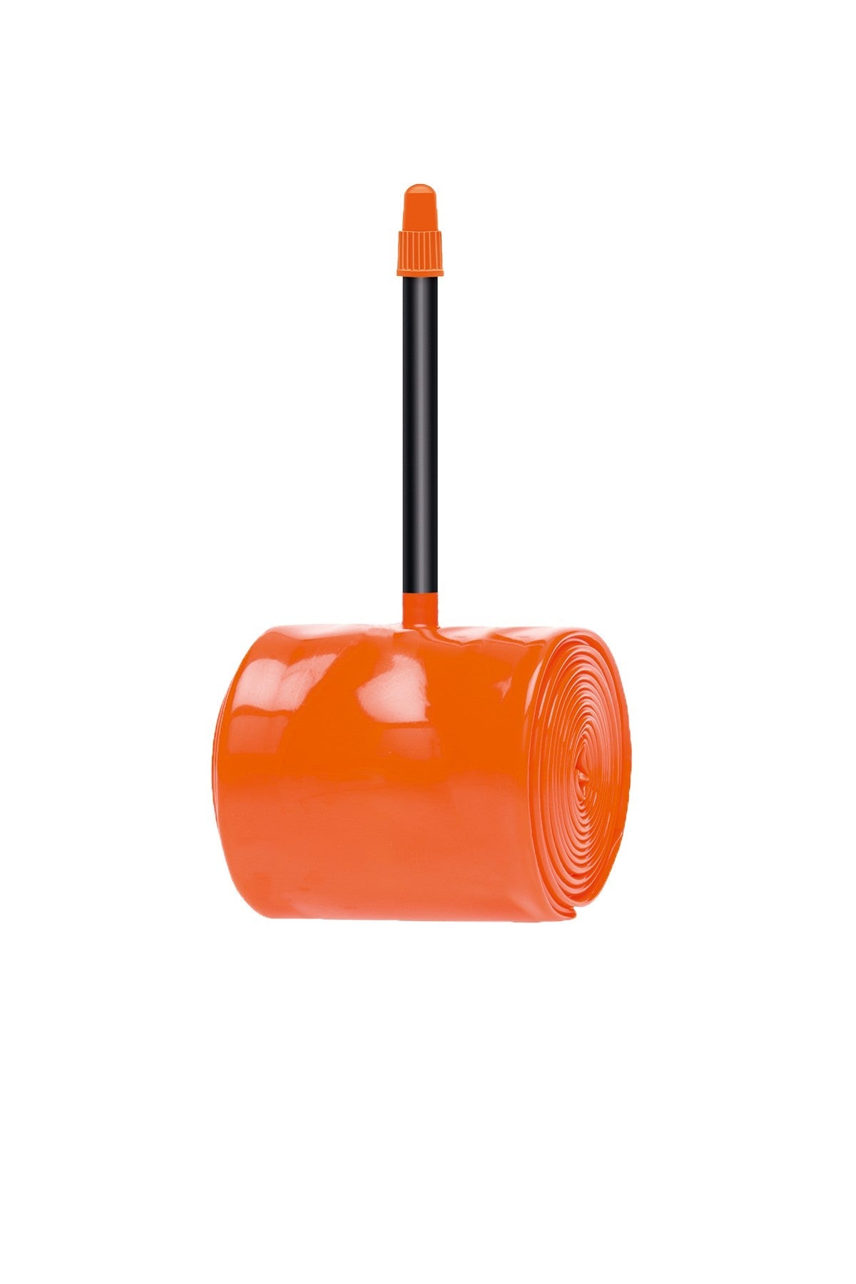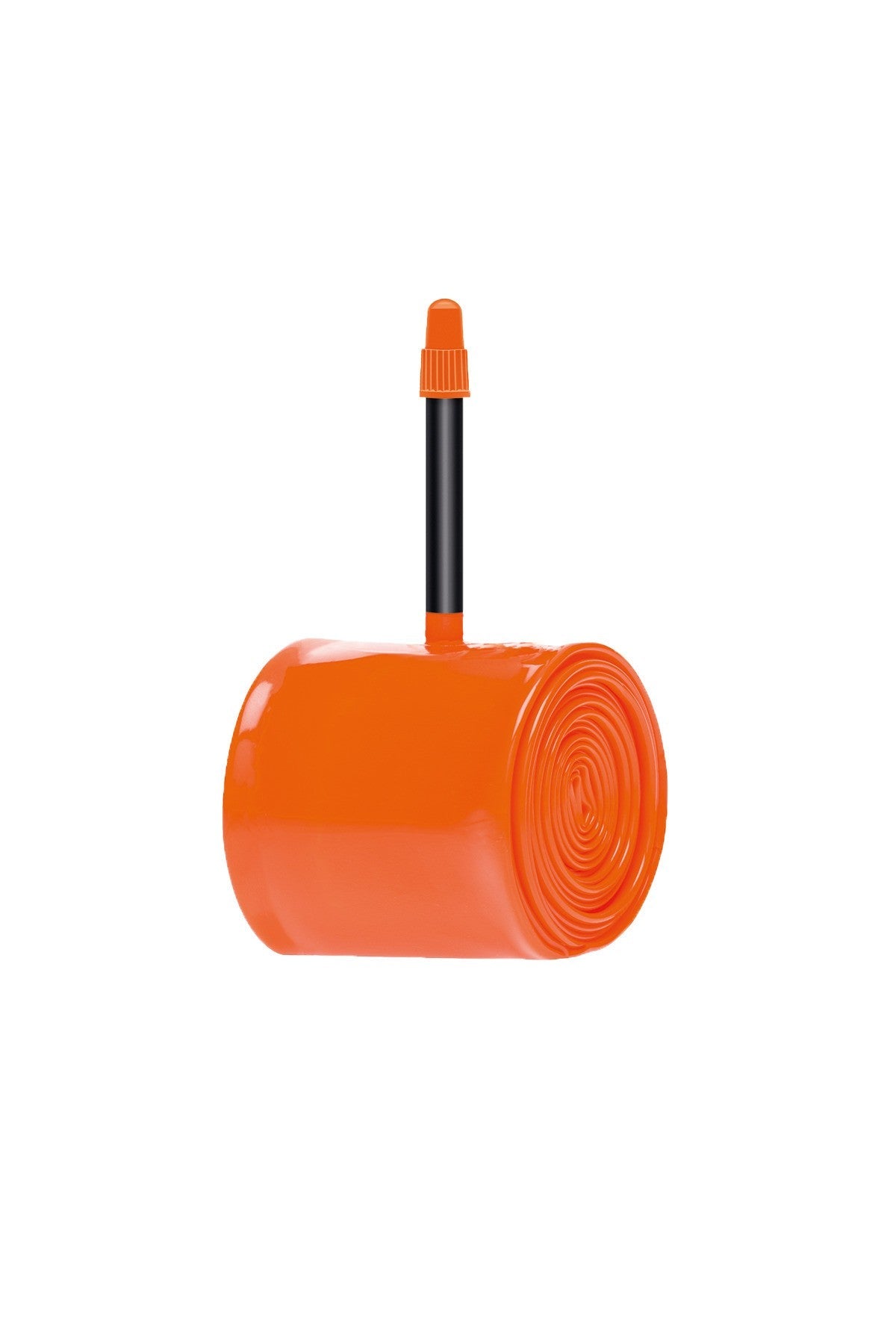Made for tire widths from 32 mm to 50 mm and ready for rim brakes and disc brakes, the Tubo-CX/Gravel-All is twice as robust as standard tubes. At the same time, due to its low weight of 60 grams, it guarantees twinkle-toed rides. The 50 % smaller packed size makes it also a spare tube which fits in every pocket. Besides 700C tires it is also ready for 650B wheels. Available with black and orange valves.