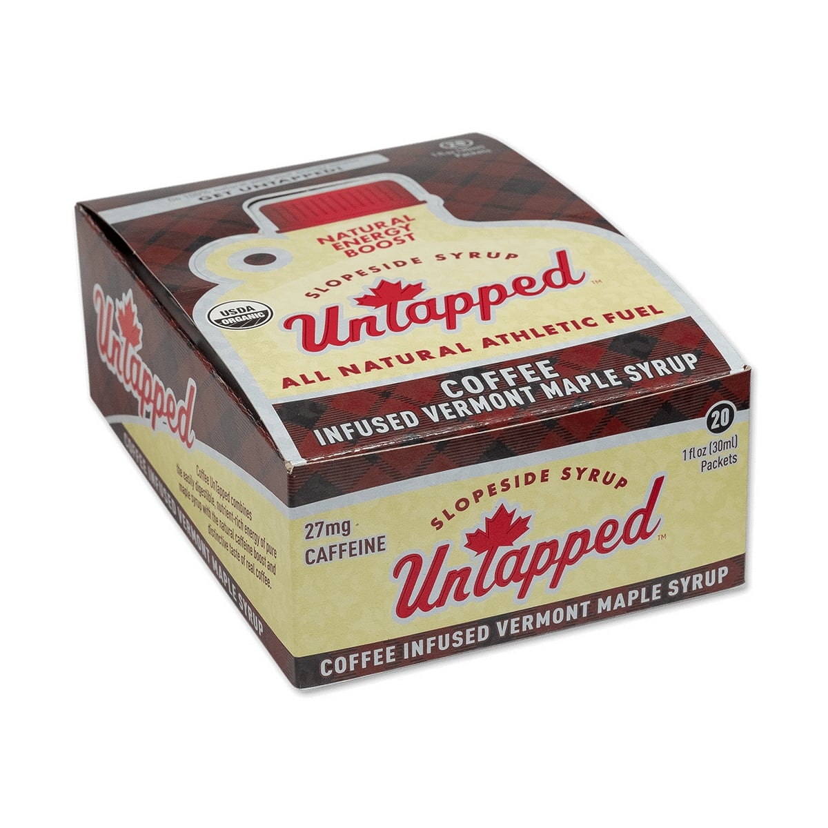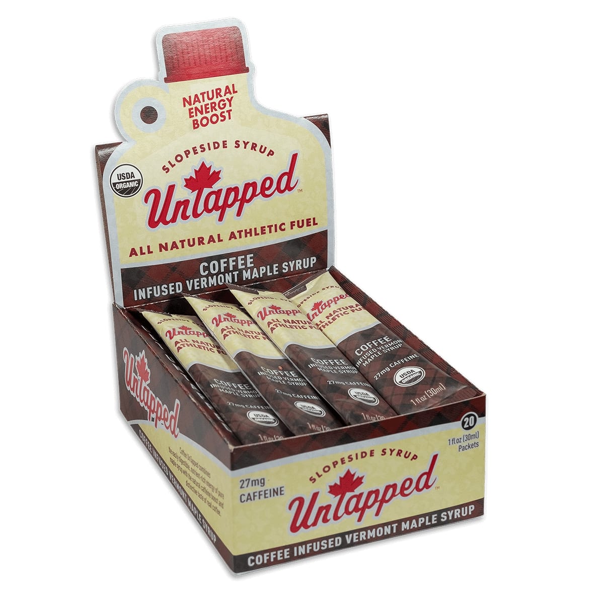 Real coffee infused into Pure Vermont Maple Syrup. All the amino acids, electrolytes and minerals of pure maple syrup with an added kick of 27mg caffeine* from real coffee. Great for when you need extra energy near the finish or to help wake you up Monday morning.Ingredients:Organic Pure Vermont Maple Syrup, Coffee.Nutrition Facts:Nutrition Facts Servings: 1 Serving Size: 1 Packet (38g), Amount per serving: Calories 100, Total Fat 0g (0% DV), Sodium 11mg (0% DV), Total Carb. 26g (9% DV), Total Sugars 25g (Incl. 25g Added Sugars 50% DV), Protein 0g ( 0% DV), Calcium (4% DV), Iron 0.2mg (1% DV), Potassium 80mg ( 2% DV), Thiamin (2% DV), Riboflavin (30% DV), Magnesium (2% DV), Zinc (4% DV), Manganese (60% DV)